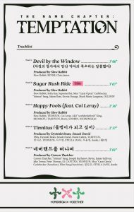 ‘THE NAME CHAPTER: TEMPTATION’ depicts youth on the brink of adulthood. The newest EP is yet again a conceptual album which tells a cohesive story through its individual tracks. ‘THE NAME CHAPTER: TEMPTATION’ represents a generational narrative of journeying forward despite challenges of the world throughout.